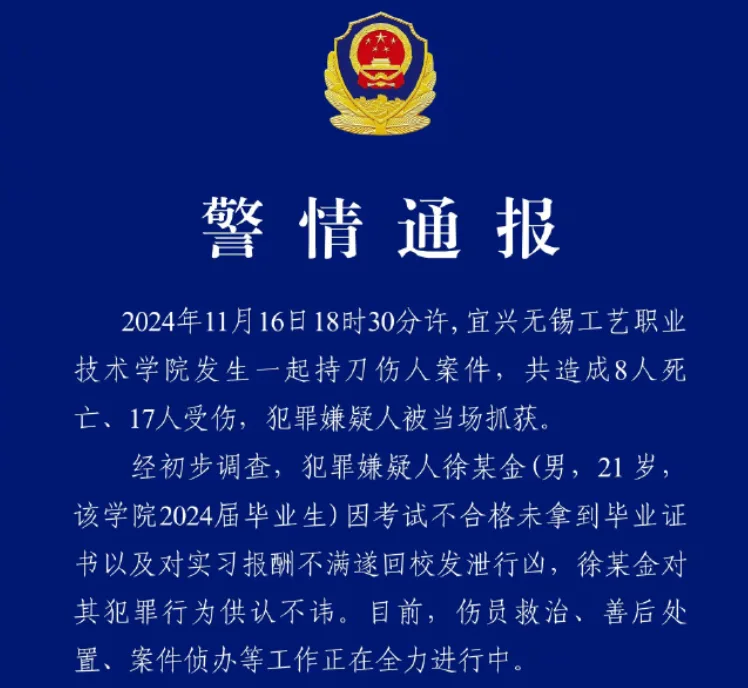 热门头条 8死17伤:宜兴无锡一技术学院突发持刀伤人案件 0 唐人日报11月17日讯:近日,宜兴无锡工艺职业技术学院发生一起持刀伤人案件,造成8人死亡17人受伤,犯罪嫌疑人被当场抓捕,案件正在调查处理中。Continue ReadingPrevious 珠海驾车撞人案嫌疑人被逮捕Next 江苏一父亲顶包肇事儿子 双双被罚 延伸阅读 热门头条 密密麻麻!福建一查扣点堆满电动车 网友:这得罚了多少人 0 热门头条 马路中间举锦旗“致谢”!上海美团骑手街头控诉报酬被克扣 0 热门头条 退市多年负债超两百亿,乐视网突然宣告要拿1.8亿元炒股 网友:为何不还债? 0 热门头条 陕西未完工自建房遭强拆 村民哭诉无家可归 0 热门头条 广东潮州沙溪镇突发工厂大火:火势迅猛冲天,黑烟压顶! 0 热门头条 像货车司机一样强制休!外卖新国标引热议 骑手怕收入缩水 0 发表回复 取消回复您的邮箱地址不会被公开。 必填项已用 * 标注评论 *显示名称 * 邮箱 * 网站 在此浏览器中保存我的显示名称、邮箱地址和网站地址,以便下次评论时使用。