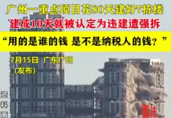唐人日报7月18日讯:近日,广州白云区发生一起令人震惊的“闪建闪拆”事件——位于陈田花园附近的“湾区智荟园”项目,在80天内火速建成7栋楼,却在短短十多天后被全部拆除,引发舆论哗然。