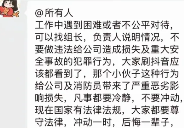 通知中指出,若员工在工作中遇到困难或感到不公平,应及时向负责人反映,通过正当渠道解决问题。企业明确表态,绝不容忍任何因情绪失控导致的极端举动,尤其是可能造成公司损失或重大安全事故的违法犯罪行为。