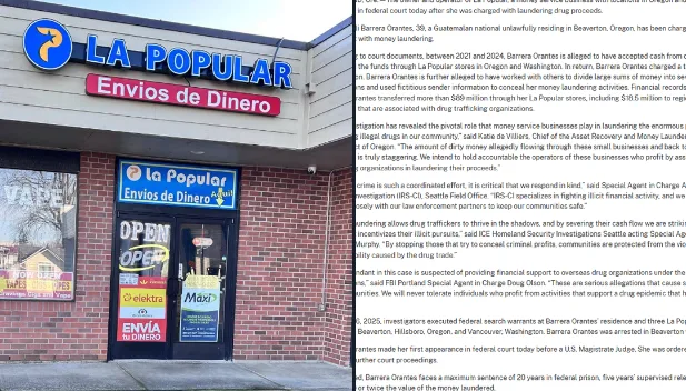 唐人日报4月22日讯:上周,联邦执法部门起诉非法移民、危地马拉公民布伦达·莉莉·巴雷拉·奥兰茨(Brenda Lili Barrera Orantes),指控其通过经营位于俄勒冈州与华盛顿州的汇款公司“La Popular”涉嫌大规模洗钱。