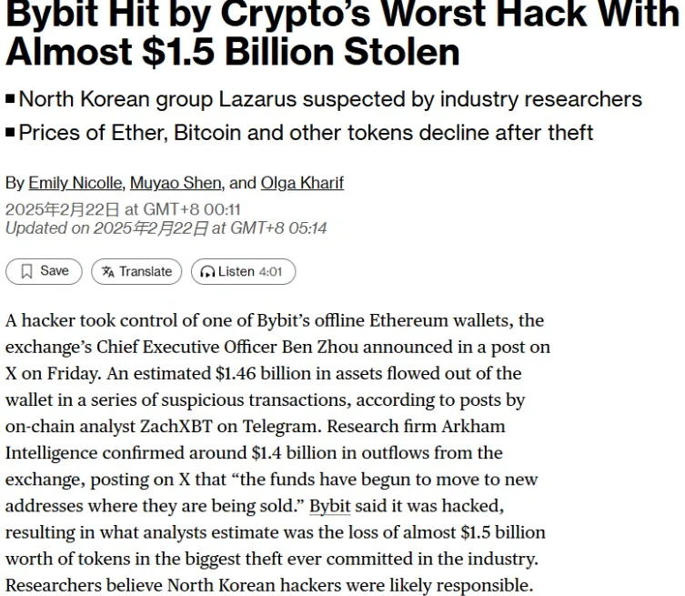 唐人日报2月23日讯:近日,全球最大加密货币交易所之一Bybit遭遇黑客攻击,导致其离线以太坊钱包被盗,损失金额预计高达15亿美元。这起事件被认为是加密货币行业历史上最严重的盗窃案件。区块链分析师ZachXBT称,黑客通过一系列可疑交易转移了约14.6亿美元的资产。