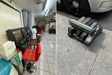 在其中一个区域,执法人员发现了17台老虎机,形成了一个地下赌博窝点。另一个储藏空间则堆满了假冒的名牌包和配饰,涵盖Prada等知名品牌。FDNY随后在社交平台发布的照片显示,老虎机沿着狭窄走廊靠墙摆放,而假冒商品被塞进成袋的塑料袋中,几乎占满了房间。