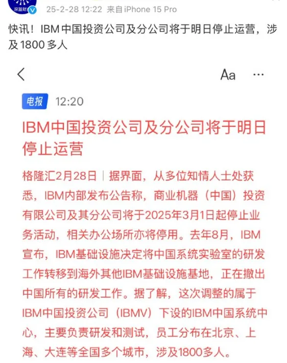 唐人日报3月1日讯:据报道,IBM中国投资公司及其分公司将于3月1日起停止运营,涉及约1800名员工。此次停运是IBM公司全球战略调整的一部分,旨在优化资源配置和提高整体运营效率。受此影响的员工将面临重新安排或离职,具体的补偿和安置方案尚未披露。