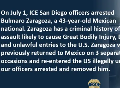 唐人日报7月7日讯:美国移民与海关执法局(ICE)在加州圣地亚哥逮捕了43岁的墨西哥公民布尔马罗·萨拉戈萨(Bulmaro Zaragoza)。萨拉戈萨有多项严重犯罪记录,包括可能导致严重人身伤害的袭击罪、非法入境以及非法滞留美国。