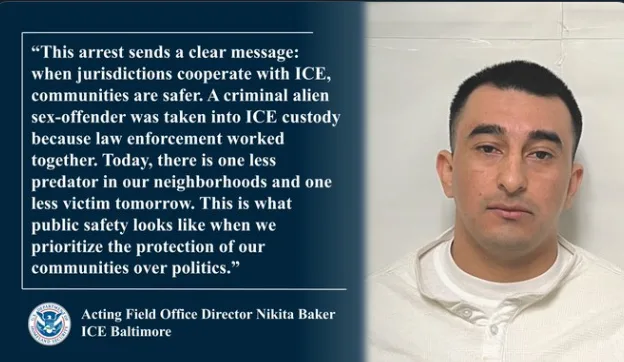 “这次逮捕发出了一个明确的信息:当地方司法系统与ICE密切合作时,我们的社区会更安全。”ICE巴尔的摩外地办事处代理主任Nikita Baker表示,“今天少了一个性犯罪者,明天就可能少一个受害者。公共安全必须凌驾于政治之上。”
