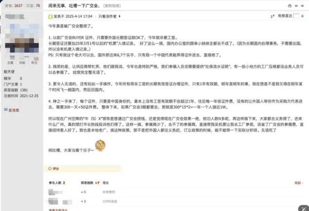 唐人日报4月16日讯:2025年中国进出口商品交易会(广交会)将于4月15日至5月5日如期在广州举办,作为中国对外贸易的重要窗口,该展会历来吸引大量海内外采购商与参展商。然而,近期在多个社交论坛上,有网友吐槽本届广交会在入场规定上“门槛变高”,引发争议。