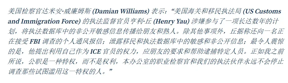 邱亨利曾是ICE纽约办公室的移民遣返主管,他在任职期间拥有访问多个由国土安全部(DHS)运营的执法数据库的权限,这些数据库包括: