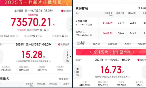 唐人日报5月8日讯:2025年五一档电影票房表现惨淡,截至目前总票房仅7亿元,创下近年来同期新低。相比之下,2023年与2024年五一档票房均突破15亿元,2021年在疫情影响下也仍有16亿元进账。今年这一“惨淡”成绩单令人错愕。