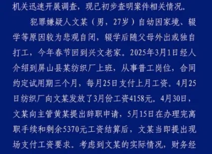 通报指出,文某所工作的公司此前已结算其工资共计5370元,目前剩余部分正按流程审批发放。文某因生活困顿、心理压力大,急于拿到工资留给母亲后自杀。在工资未能及时到账的情况下,其情绪崩溃,产生“破罐子破摔”念头,遂纵火实施报复。