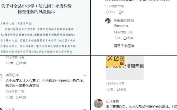这份通知在网络发布后迅速引发热议,尤其在教育群体中引发广泛寒心和不满。众多一线教师在评论区留言:“出事全是老师的错?压力全甩给我们,老师不是防爆盾!”、“每天既要教书育人,还要情绪稳定、心理疏导、控制风险,现在还得防止被伤害。”