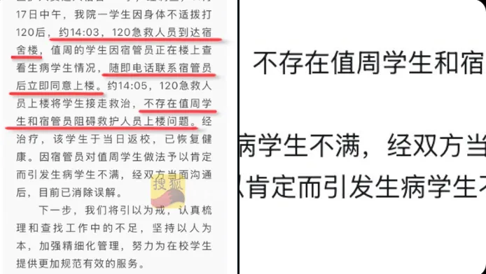 唐人日报11月29日讯:近日,山东淄博职业学院发布通报,否认值周学生阻止急救人员进入女生宿舍救人。然而,细心网友发现通报内容自相矛盾。前文称不存在阻止救护人员上楼的问题,但后文又提到“因宿管员对值周学生做法予以肯定而引发生病学生不满”,变相承认事件确实发生。