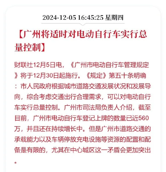 唐人日报12月9日讯:广州市近日发布新规,提出将适时对电动自行车实行总量控制。这一举措旨在缓解城市交通压力,优化道路资源配置,同时提升电动车管理水平。