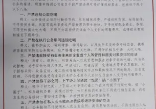 据悉,这份“八项禁令”明确规定:党员不得参加同学会、老乡会、战友会等非组织性聚会;不得参与或操办任何形式的“大操大办”婚丧喜宴;即使在非工作时间,也不得出现饮酒过量、酗酒或醉酒等行为;同时,要求坚决杜绝隐形吃喝、私下宴请、变相公款消费等违规现象。