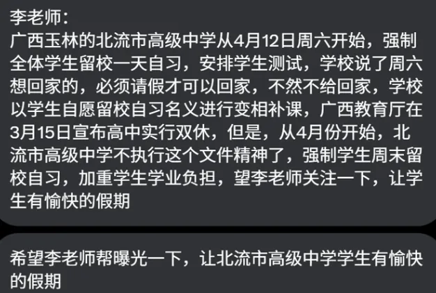唐人日报4月18日讯:近日广西玉林北流市高级中学被曝强制全体学生于每周六留校参加自习与测试,形式上虽称“自愿”,实则不请假不得离校,引发家长与社会广泛关注。多名学生和家长反映,学校以“自习”名义进行变相补课,严重违反了广西教育厅关于高中阶段学校“双休制”的明确规定。