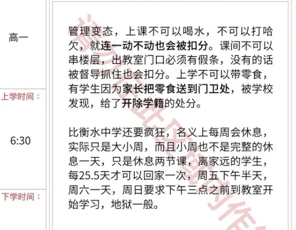 在休息安排上,学校名义上实行每周轮休,实则为“大小周制”,其中所谓“小周”仅允许学生休息两节课。而远途学生每隔25.5天方可返家一次,实际周末也形同虚设——周五下午才能离校,周六休息一天,周日则需在下午3点前返校学习。学生形容其为“地狱式管理”。