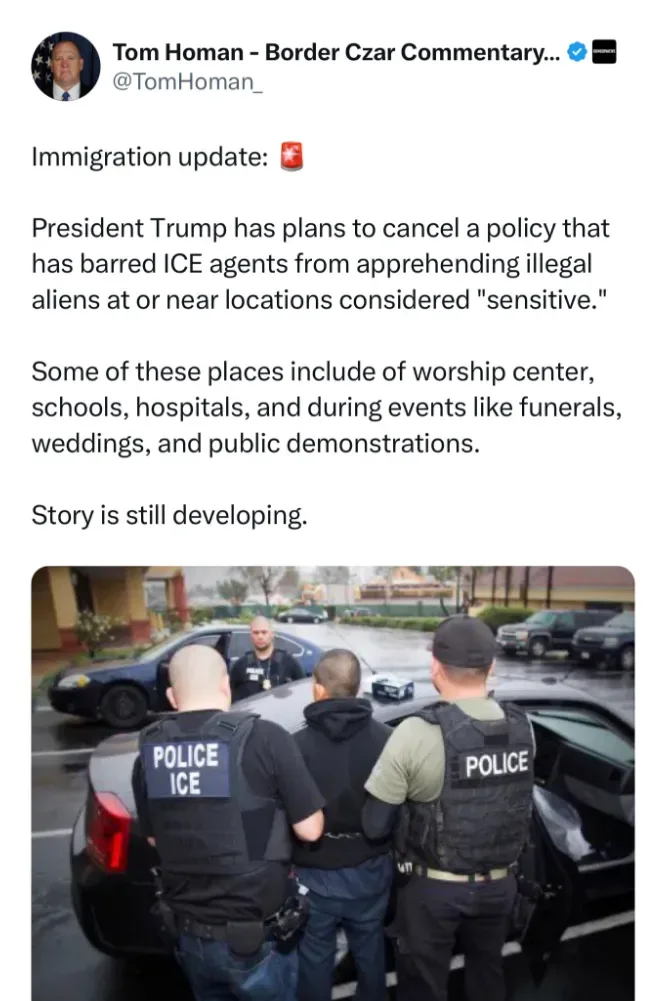 边境沙皇:特朗普总统再出新政推翻拜登“敏感地点”豁免法令,ICE特工抓捕非法移民无禁区!