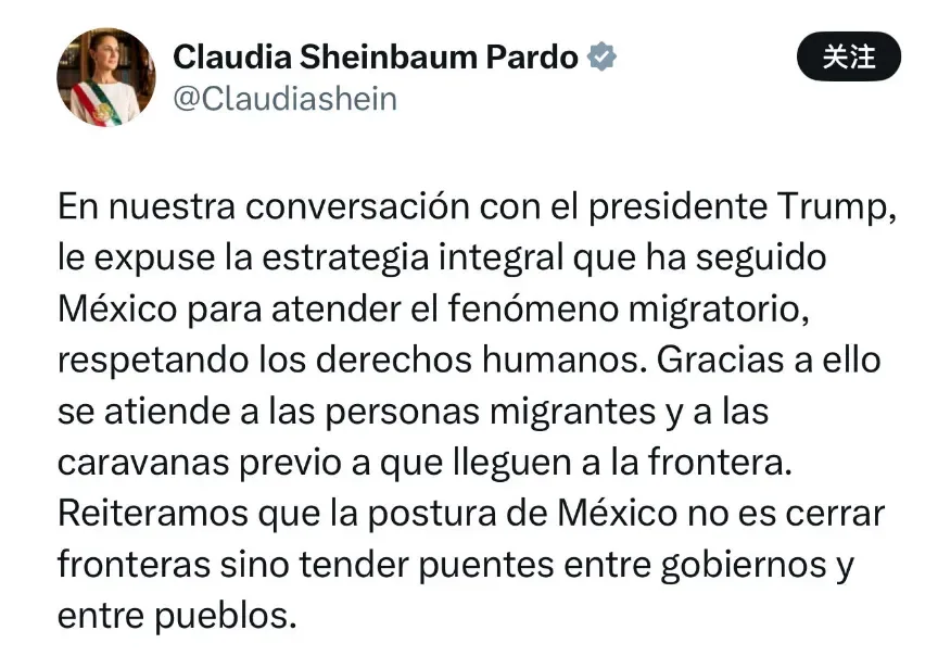 墨西哥总统克劳迪娅·谢因鲍姆在声明中明确表示,墨西哥将承担起更大的责任,通过强化边境控制和执法力度,在移民尚未抵达美墨边境前进行阻断。核心内容包括: