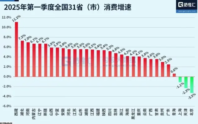 唐人日报4月30日讯:根据格隆汇最新发布的2025年第一季度全国31个省(市)消费增速排名数据,区域间消费表现出现明显分化。其中,作为中国经济“窗口”的北京与上海消费增速竟位列倒数,北京同比下滑3.3%,上海下滑1.1%,双双陷入负增长区间。