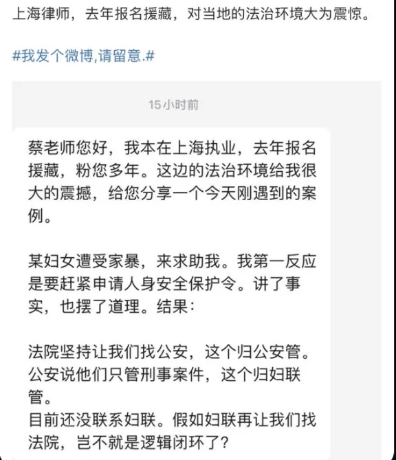 唐人日报3月19日讯:上海援藏律师蔡雅奇近日介绍了一个案例,反映了当地对家庭暴力受害者的保护系统存在的问题。据蔡律师描述,一名藏族妇女在遭受家庭暴力后向她求助。蔡律师随后向法院申请人身安全保护令,希望能为受害者提供法律保护。然而,令人失望的是,法院并未受理此申请,而是建议她前往当地公安部门寻求帮助。