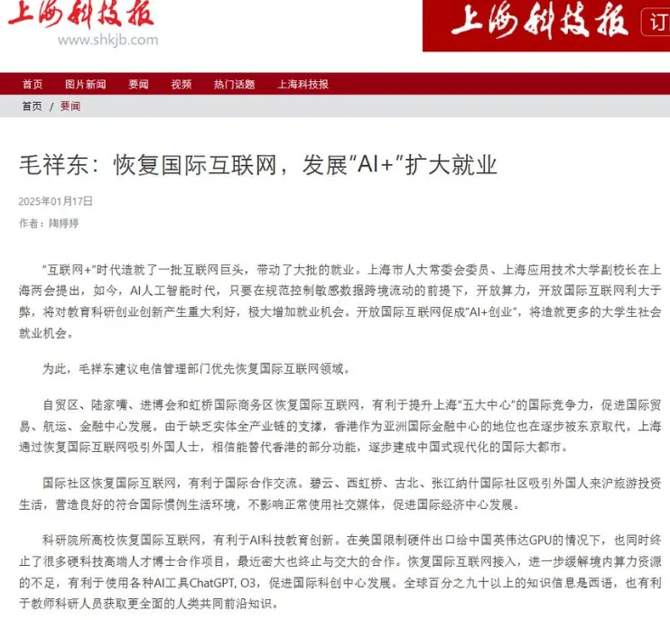 唐人日报1月18日讯:近日,上海人大常委会委员毛祥东表示,随着AI人工智能时代的到来,只要能规范控制敏感数据的跨境流动,开放国际互联网将带来更多利弊。