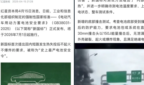 新规将于2026年7月1日起正式实施,留出一年多的过渡期,便于车企与电池制造商进行产品适配与安全升级。业内人士认为,该标准将对动力电池技术路线、热管理系统及整车安全架构带来深远影响,或重塑整个新能源汽车行业的安全门槛。