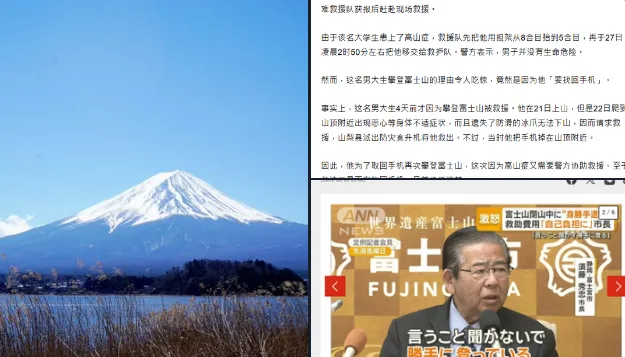 据报道,该名中国留学生于4月21日首次违规攀登富士山,抵达山顶附近时因身体不适发出求救信号,获直升机紧急营救。岂料仅5天后的4月26日,他竟再次擅自进入富士山区域,称是为了“取回上次遗失的手机”,结果因高山症再度倒地,又被警方救出。