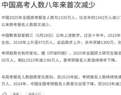 唐人日报6月3日讯:教育部公布的数据显示,2025年全国高考报名人数为1335万人,较2024年减少7万人。这是自2017年以来,中国高考报名人数首次出现下降。多年来连年攀升的“高考热”在今年悄然转向,引发社会广泛关注。