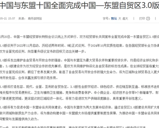 唐人日报5月27日讯:中国商务部宣布,中国—东盟经贸部长特别会议于5月20日以线上形式顺利举行,双方共同宣布已全面完成中国—东盟自由贸易区3.0版谈判。这标志着中国与东盟经贸合作迈入更高水平的互利共赢阶段。