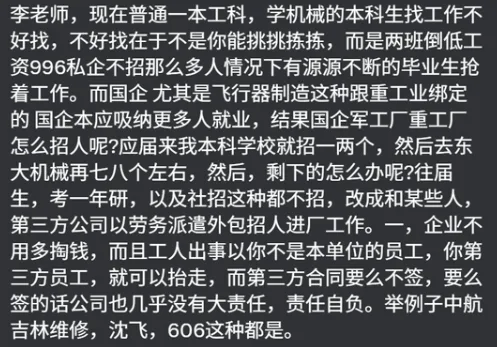 普通本科毕业生多数只能通过劳务派遣形式进入,如中航吉林维修、沈飞、606所等企业,普遍以外包方式雇佣基层员工。派遣员工不仅待遇低,且缺乏基本保障,出现工伤也易被推卸责任,合同更是形式大于实质。