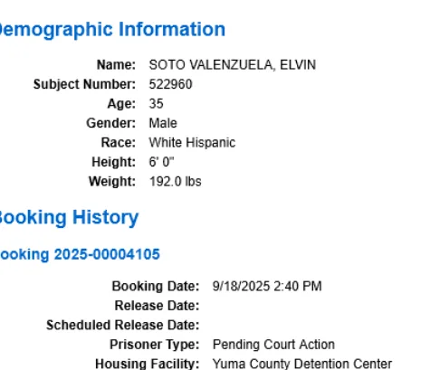唐人日报10月9日讯:当地执法部门证实,一名来自中美洲的非法移民埃尔文·索托·巴伦苏埃拉(Ervin Soto Valenzuela)于上个月被捕,罪名是与未成年人发生性行为及性侵犯。他目前被关押在尤马县监狱,案件震惊全州,引发民众对非法移民犯罪再度上升的强烈关注。
