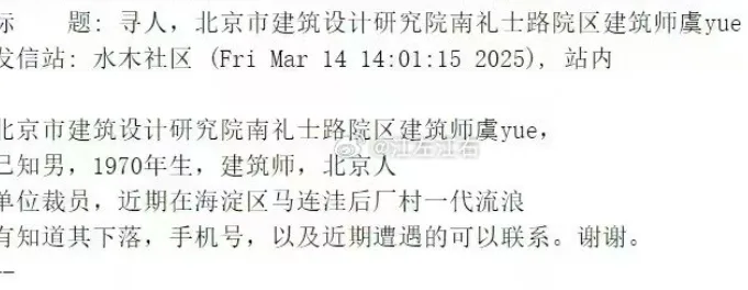 唐人日报3月16日讯:近日,北京建筑设计研究院一名建筑师在被裁员后失去联系,最近消息称该人目前在海淀区马连洼后厂村一带流浪。此消息首次由某在线论坛的用户发布,迅速引起了社会各界的广泛关注。