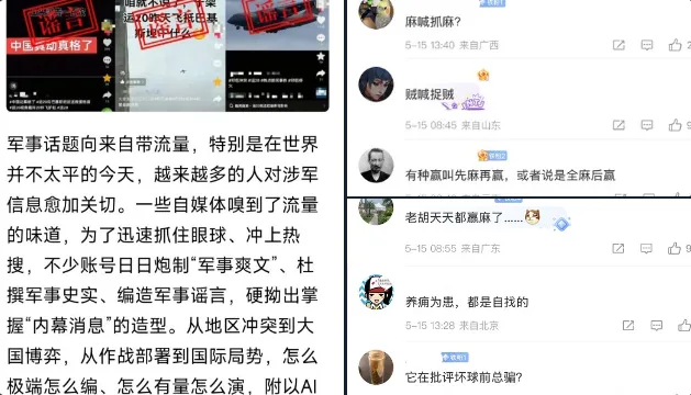 专家指出,当前部分受众军事素养不足,容易被“军事爽文”误导,进而在社交平台上形成偏激甚至极端的言论氛围,加剧信息污染。