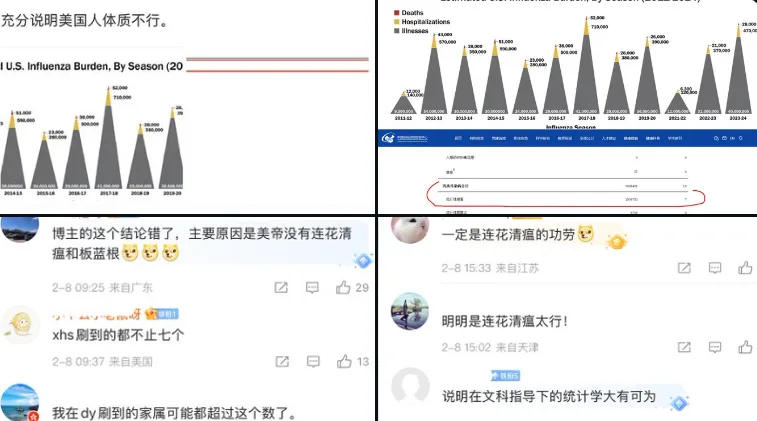 这一言论引发网友热议,部分网友在平台上表示:“小红书刷到的都不止7个。”还有网友调侃:“连花清瘟不能停。”该事件引发了对数据解读与公共卫生事件报道准确性的广泛讨论,许多人对博主的言论表示质疑。