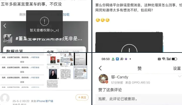 有用户表示,“只是引用了公开信息进行评论,结果不到一分钟就被系统移除。”还有人称,“删帖的速度远远快于回应公众质疑的速度。”大量网友截图证实,涉及董袭莹的帖子、转发和讨论内容,频繁出现“内容违规”提示,部分平台已禁止搜索相关关键词。