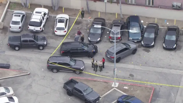 洛杉矶县警长办公室正在协助调查此案。航拍画面显示,枪击发生在一栋公寓楼附近的停车场,嫌疑人所乘绿色小型货车车窗布满弹孔,地面上标记着多处证据,现场一度戒备森严。调查仍在持续。