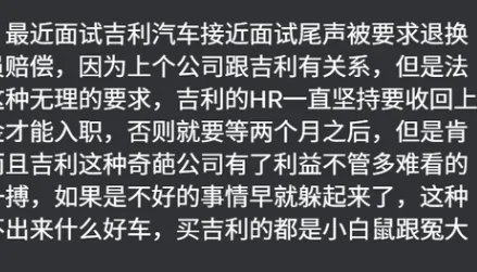 该网友指出,这一要求毫无法律依据,属于对求职者合法权益的变相干涉。更令人愤怒的是,吉利方面坚持这一说法,并表示如果不配合退赔,将需等待两个月后重新审核,但“那就基本没戏了”。
