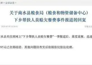 唐人日报7月28日讯:河南省商水县政府就“扶贫工作组打白条吃饭五年未还”一事发布通报,称事件曝光后已迅速成立由纪委监委、财政、审计等多部门组成的联合调查组。目前,相关单位已将拖欠餐馆的2.8万余元费用全部结清,其余问题将依法依规进一步查实处理。