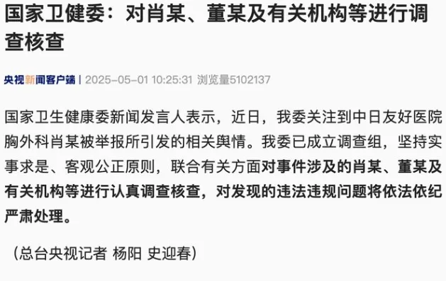 唐人日报5月6日讯:国家卫健委发布通告,决定对中日友好医院肖飞、董袭莹两人展开调查。此前,麻醉医生肖飞被曝术中离岗,致患者独自留在手术室长达40分钟,已于4月27日被医院通报开除党籍并解除聘用。董袭莹则因实名举报丈夫出轨而被网友深扒学历造假问题,引发舆论风暴。