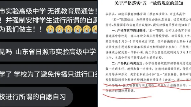 唐人日报5月7日讯:近日,山东省日照市实验高级中学被曝无视教育局下发的五一假期安排通知,擅自将原定假期缩减为两天,并以“自愿自习”名义强制要求学生提前返校上课。截至目前,学校已“自习”一天,实际相当于提前开学。