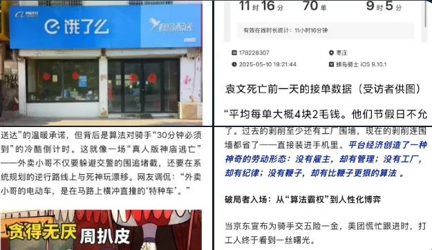“算法越精准,人性越遥远。”这是不少网友对事件的沉痛评论。在平台经济盛行的当下,骑手被推入高压、高频的劳动漩涡,成了被困在数据与考核机制中的“数字囚徒”。