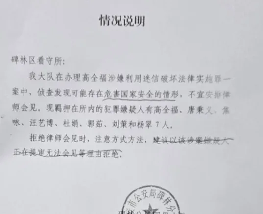 据悉,5月21日网上流出一份疑似西安市公安局碑林分局国保大队向碑林区看守所发送的《情况说明》。文件中明确要求,不允许高全福牧师等7名涉案人员与律师会见,同时提醒看守所“注意方式方法”,并附有“拒绝会见”的理由。