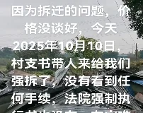 多段现场视频显示,10月10日上午,十余名身穿制服的人员携带工具进入养殖场,操作挖掘机直接推倒猪舍与仓库。现场未见法院执行人员,也无官方公告或红头文件。几名村干部在旁指挥,阻止村民拍照。一位拍摄者的手机被抢走,事后才被退回。