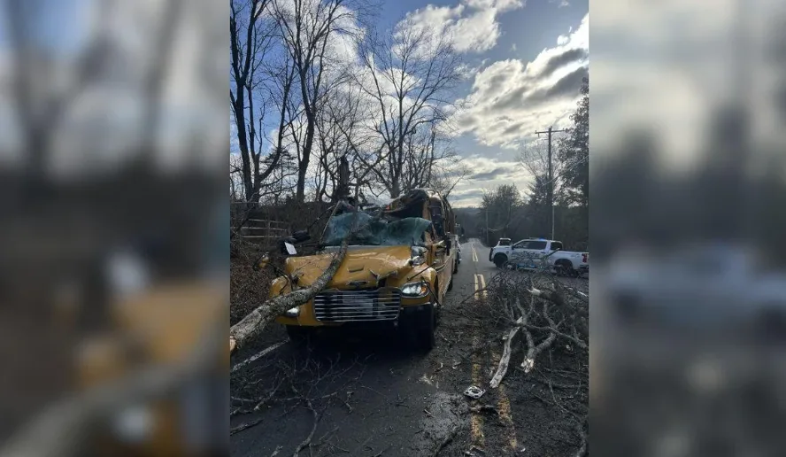 特克斯伯里镇警方表示,事故发生在早上7:08,树木突然倒塌,砸中了正在前往Old Turnpike中学的校车。事发地点靠近Fairmount Road East和Addison Drive,附近的电线也被拉断。校车载有10名学生和司机,事故发生后,学校立即启动紧急应对程序。