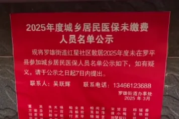 唐人日报5月15日讯:近日,云南省曲靖市罗平县度城乡罗雄街道办事处对辖区内未缴纳城乡居民医疗保险的人员进行了集中公示曝光。公示内容包括居民姓名、所属村组以及医保缴费状态,张贴于街道公共公告栏,部分区域还通过微信群和村务广播进行反复通报。