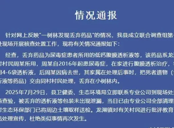 通报显示,药品使用者系龙湖镇蔡坊村村民周某。周某自2016年起在家进行腹膜透析,每日需使用4至6袋透析液。今年因病去世,其家属在处理后事时,将死者遗留的透析液等药品交由同村村民处理,后被随意丢弃在村旁小树林内。