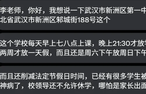 唐人日报4月18日讯:近日,有网友实名反映,位于湖北省武汉市新洲区邾城街188号的新洲区第一中学,长期实行极端作息制度,严重违反教育部门关于减负和双休的相关规定,引发社会广泛关注。