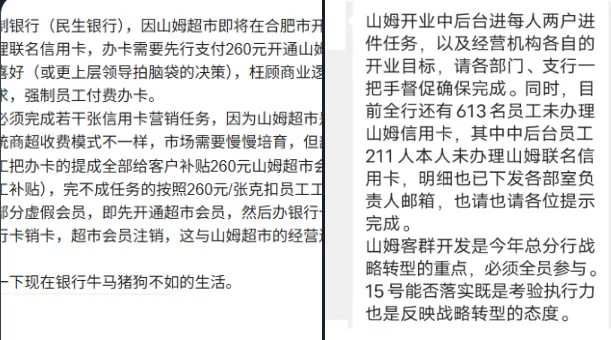 唐人日报4月16日讯:近日,有疑似民生银行安徽省分行员工在网络平台投稿称,因山姆会员店即将在合肥开业,银行内部下达通知,要求全体员工必须办理山姆联名信用卡,并强制开通山姆会员服务,需先自费支付260元年费。此举引发员工强烈不满,也在社交平台引发热议。