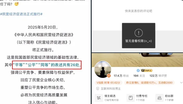 民营经济促进法》实施,博主发问“47年为何还有身份焦虑?”随后账号被封