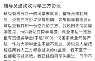 据反映,该班级约四分之一学生尚未就业,根本无法提供真实的三方协议。辅导员却建议班干部“可以帮忙打印空白三方协议,并盖上假章”,以“完善就业材料”。他还表示,就业率达到一定数值后,班级可以获得不超过1000元的奖学金作为奖励。
