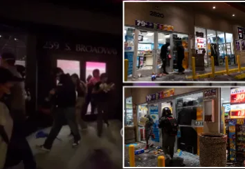 视频显示,大批人群在黑夜掩护下砸碎橱窗闯入商店,疯狂抢走手机、球鞋、衣物,甚至有人拎出巨型促销泰迪熊,引发围观者哄笑。街头弥漫着浓烈的化学物质气味,灭火器被当作玩具喷洒,警报声此起彼伏,附近车辆陷入混乱。